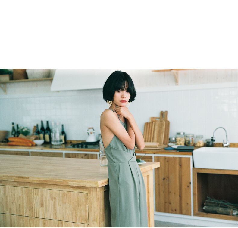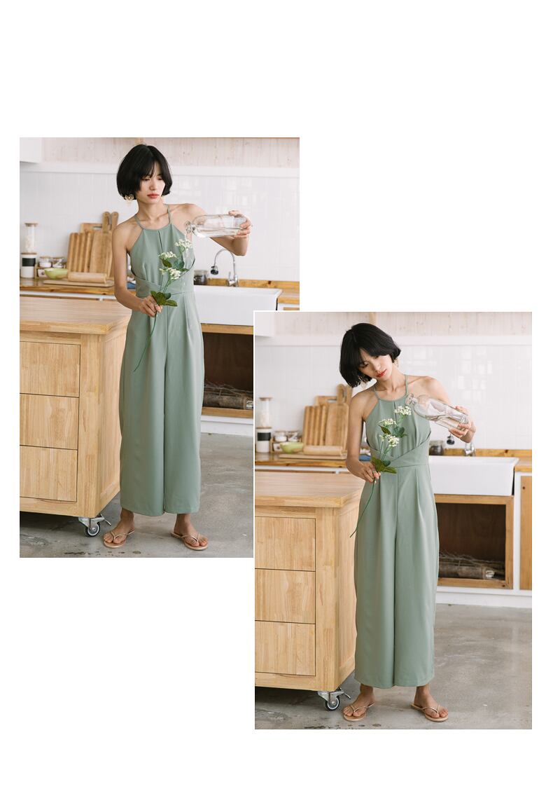 エレガントなグリーンカラーのパンツドレス。