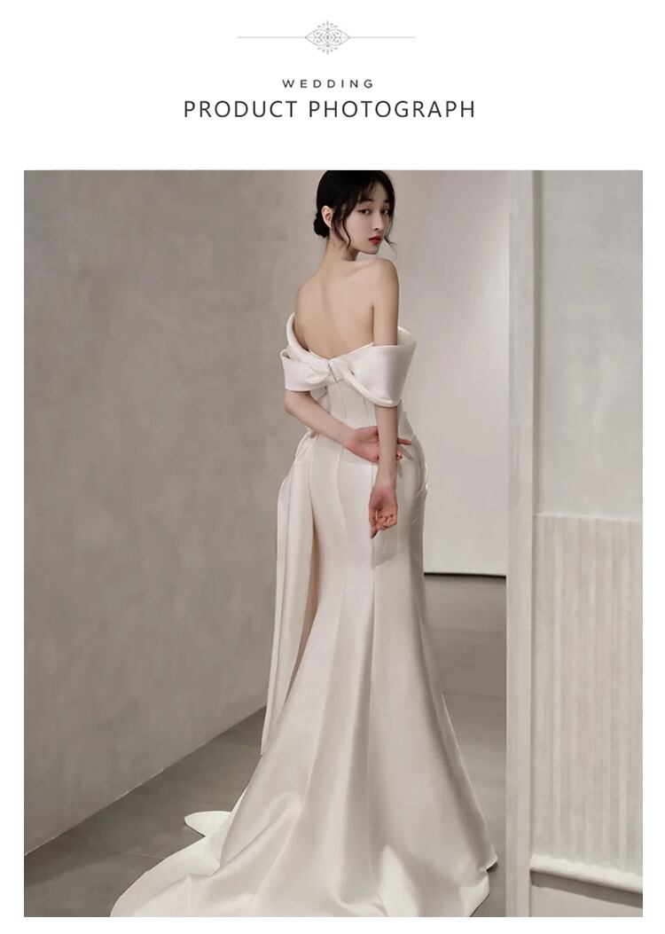 エレガントなサテン地のワンショルダーウェディングドレス。