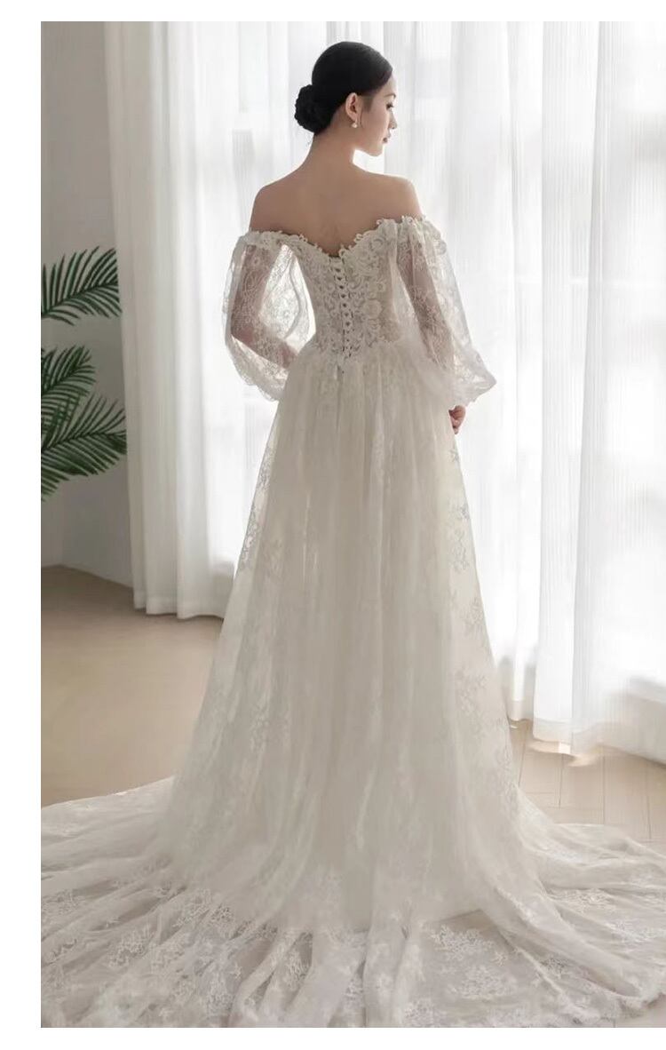 レース地のパフスリーブがエレガントなウェディングドレス。