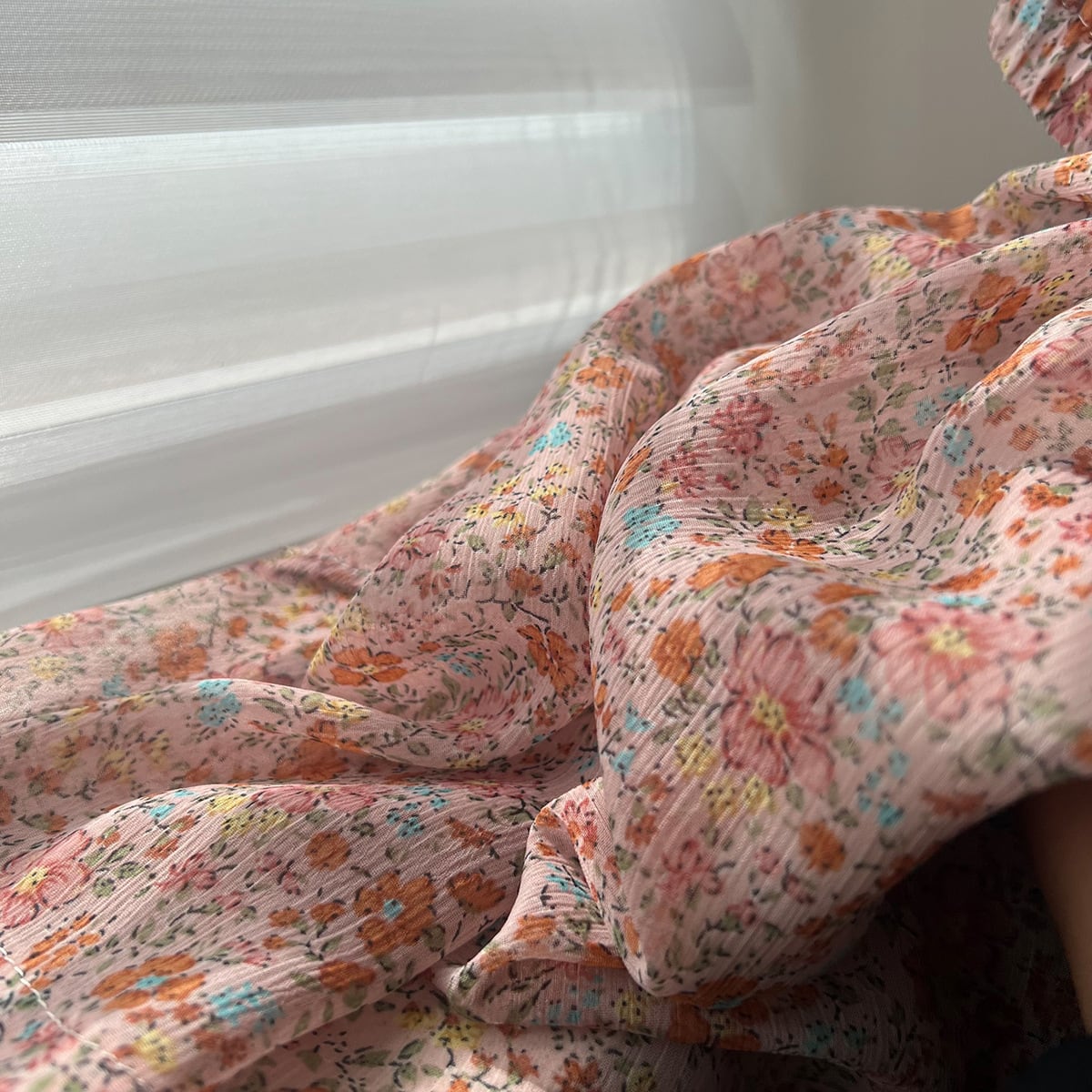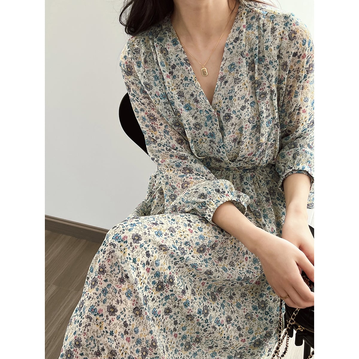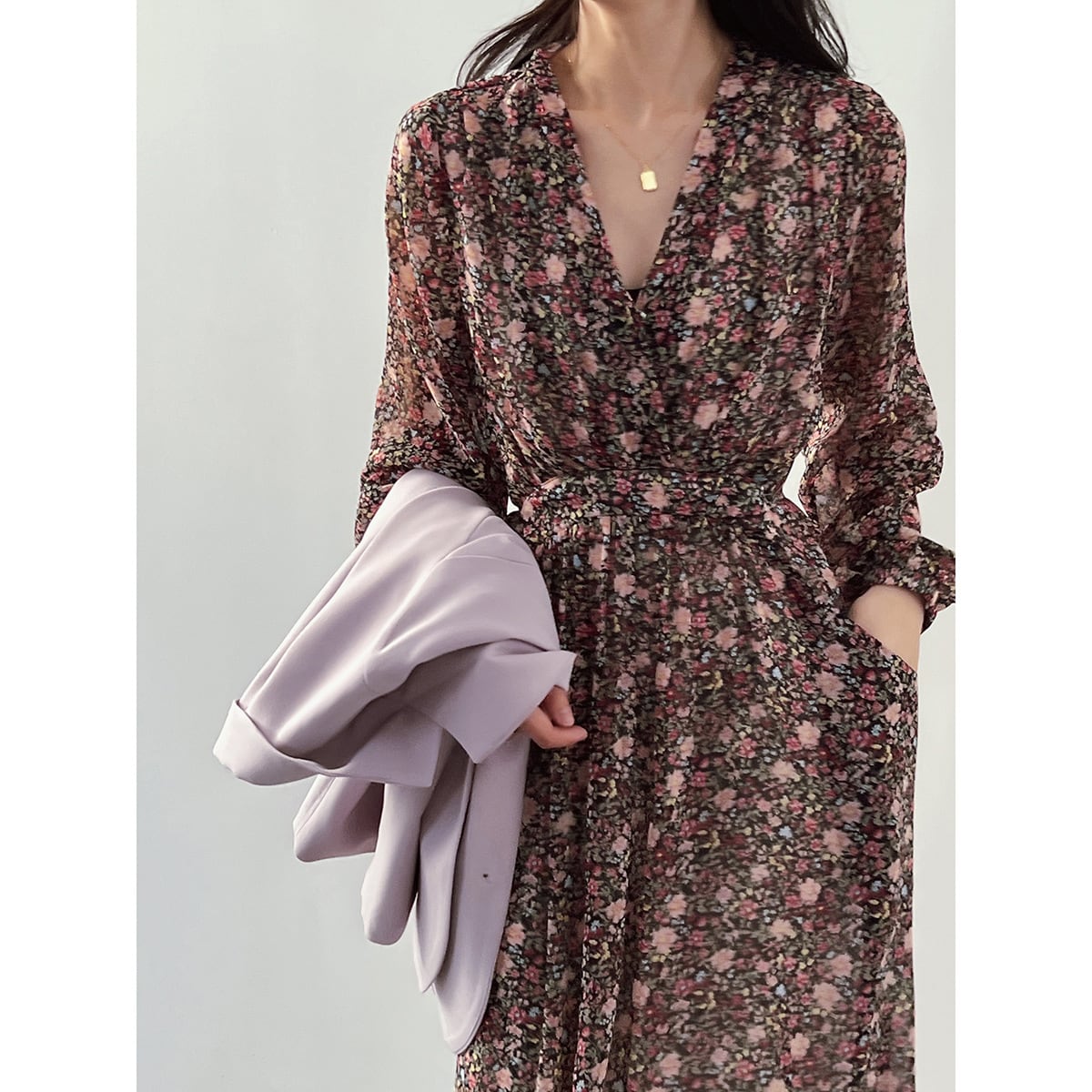 大人可愛いフローラルのカシュクールシフォンワンピース。