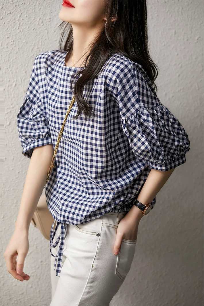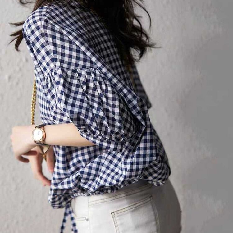 大人可愛いギンガムチェックの5分袖シャツ。