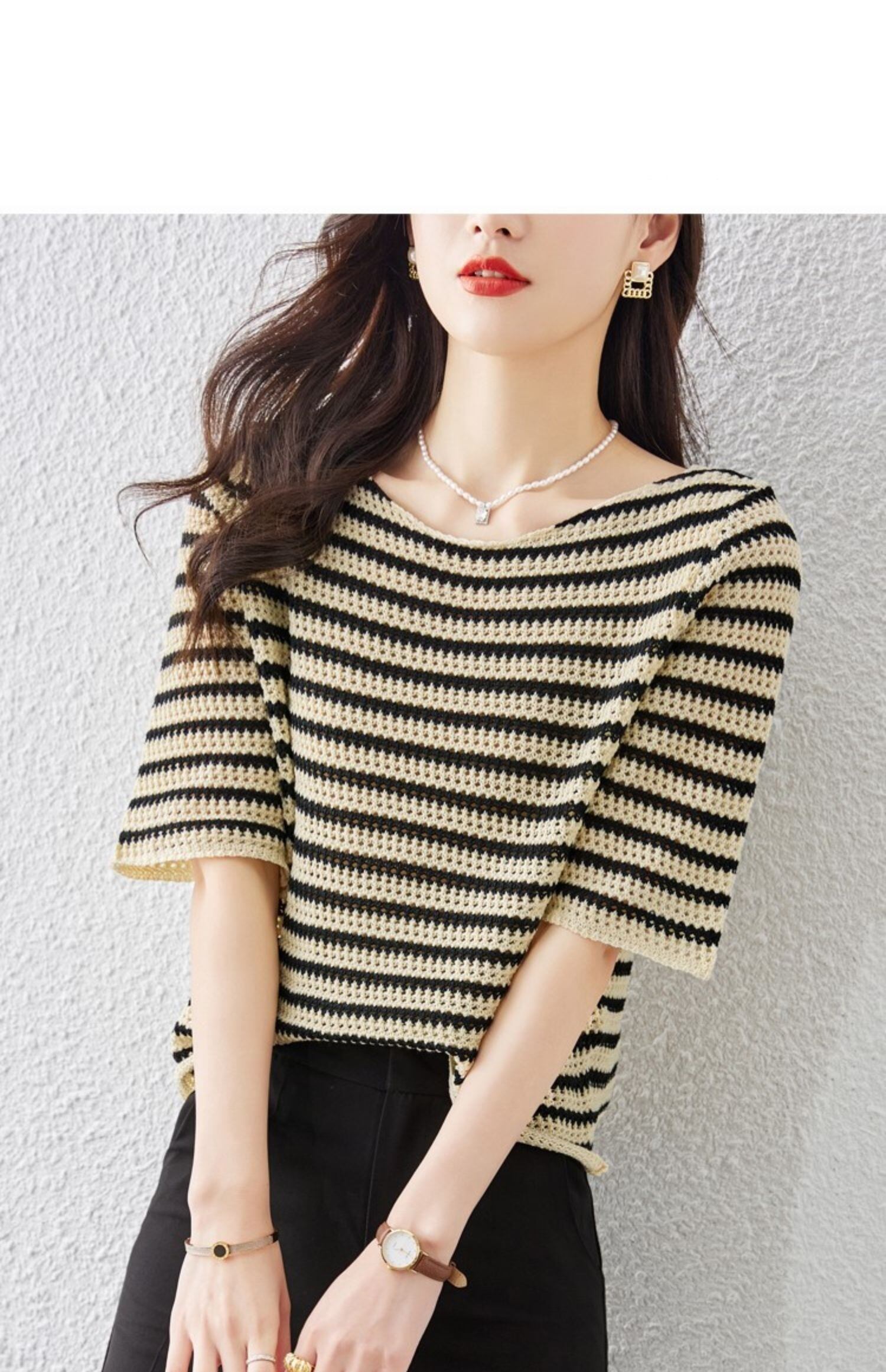 キレイめに着こなせるストライプのニットプルオーバー。