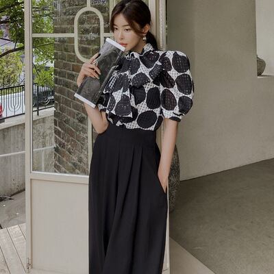 ドット柄とパフスリーブが大人エレガントなパンツドレス。