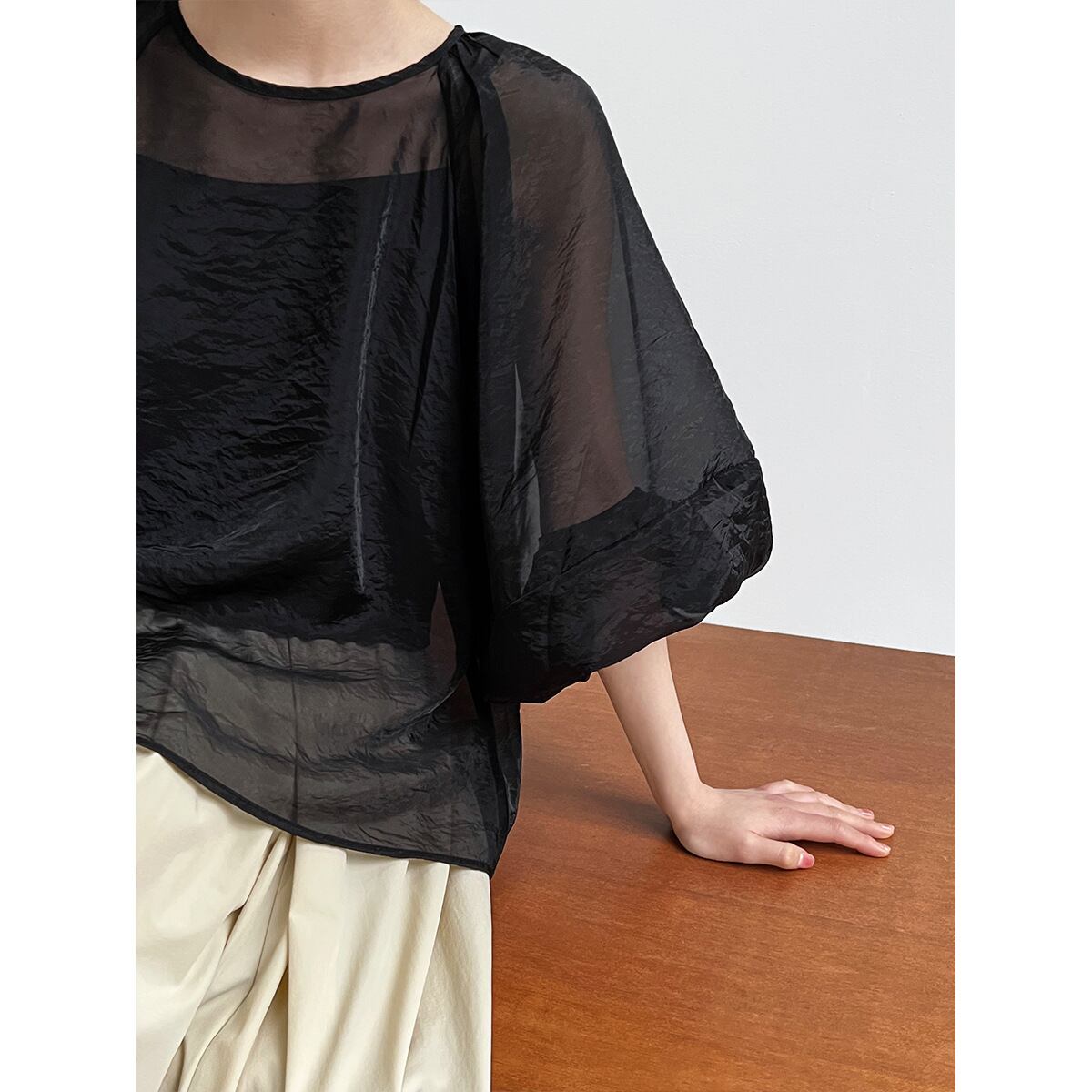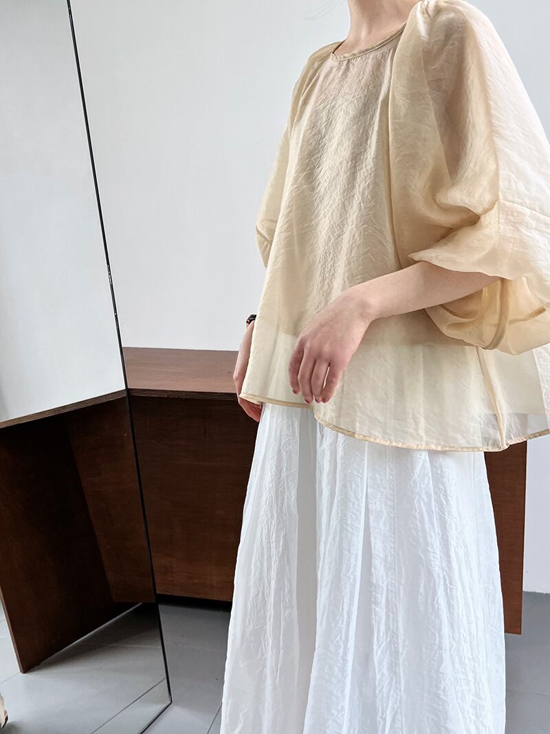 大人可愛いボリュームスリーブのシアーブラウス。