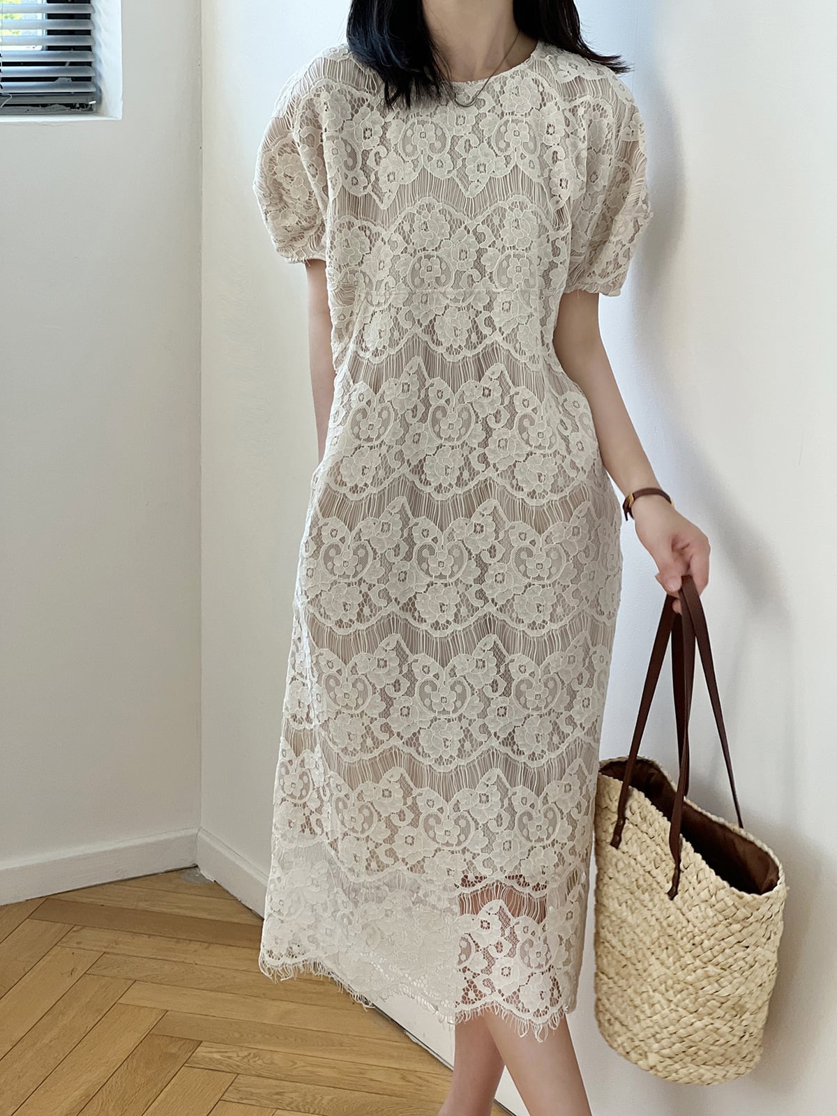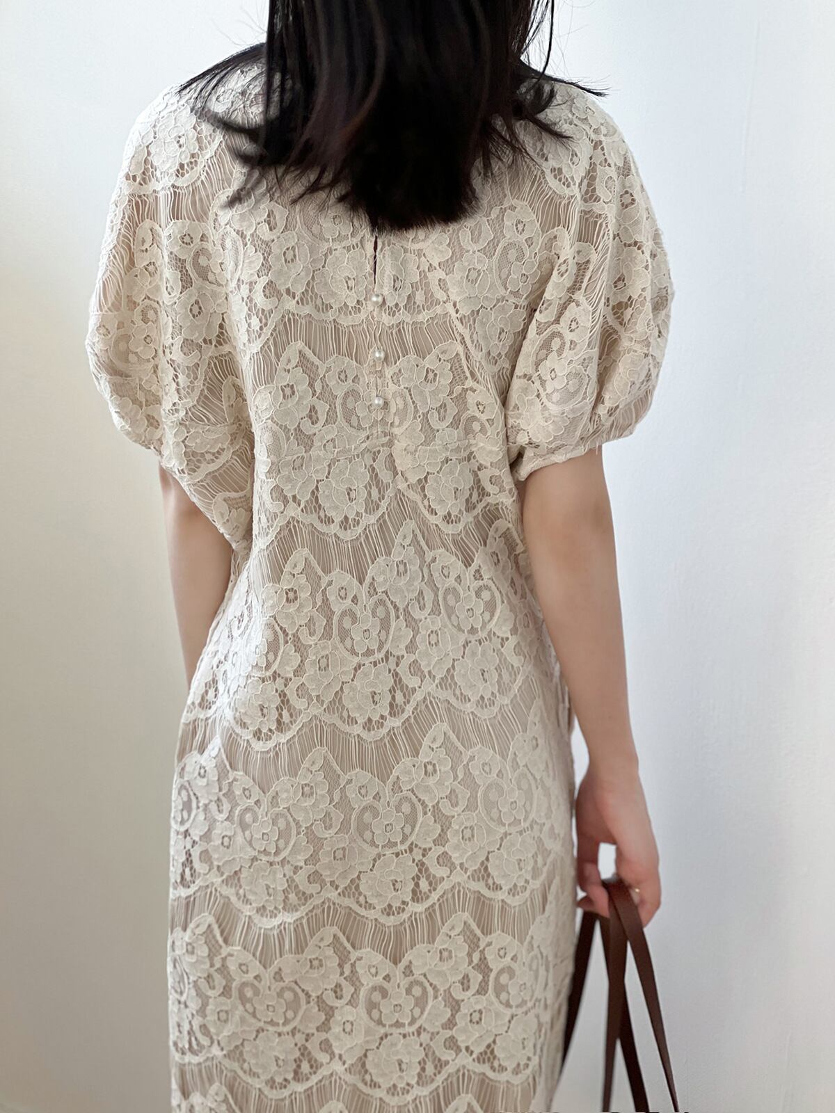 かわいらしいクリーミーホワイトの総レースワンピース。
