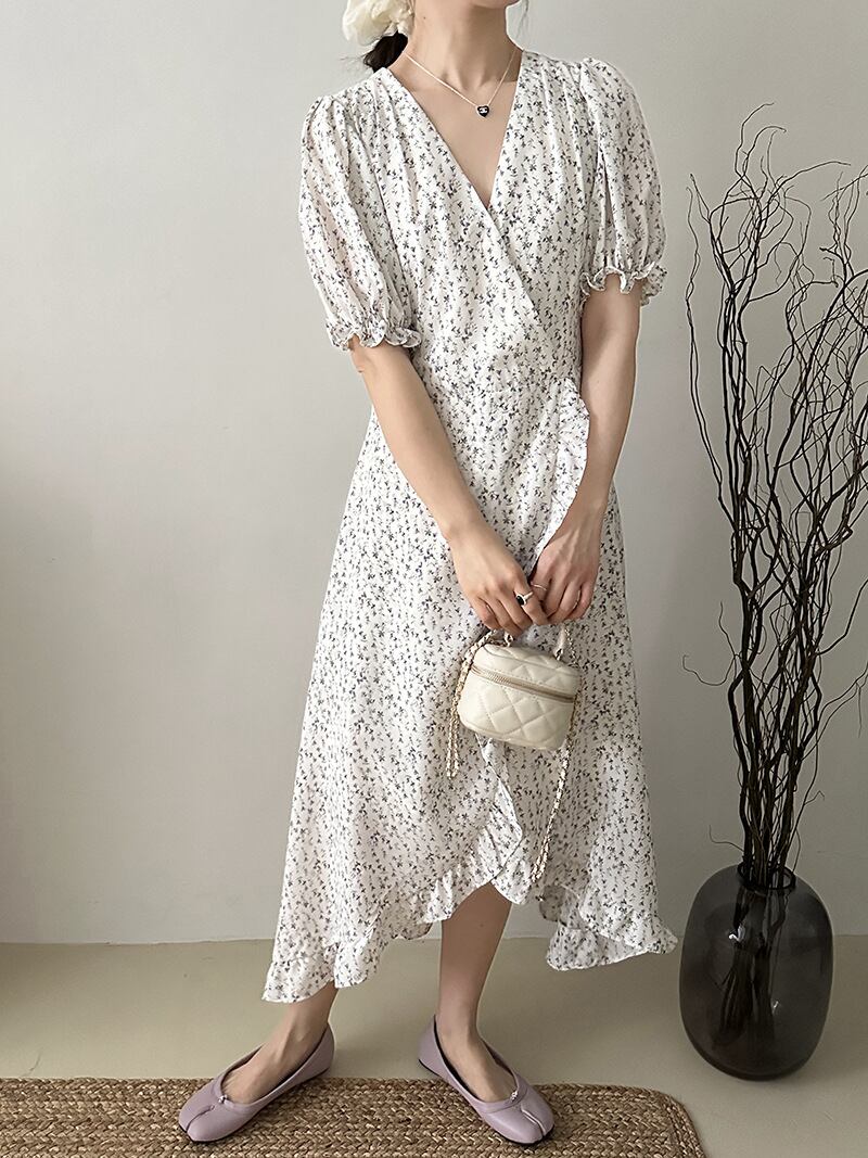 カシュクールとフリルがかわいらしい花柄ワンピース。