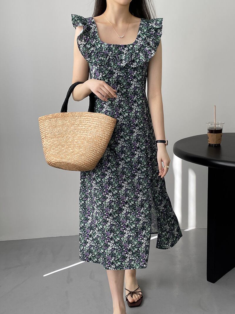 胸元のフリルが可愛い花柄プリントフリルワンピース。