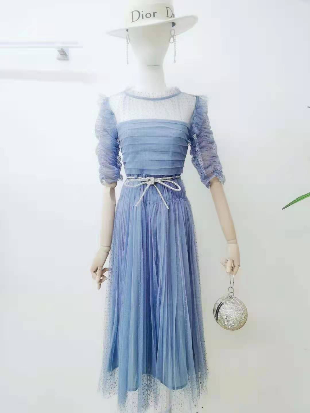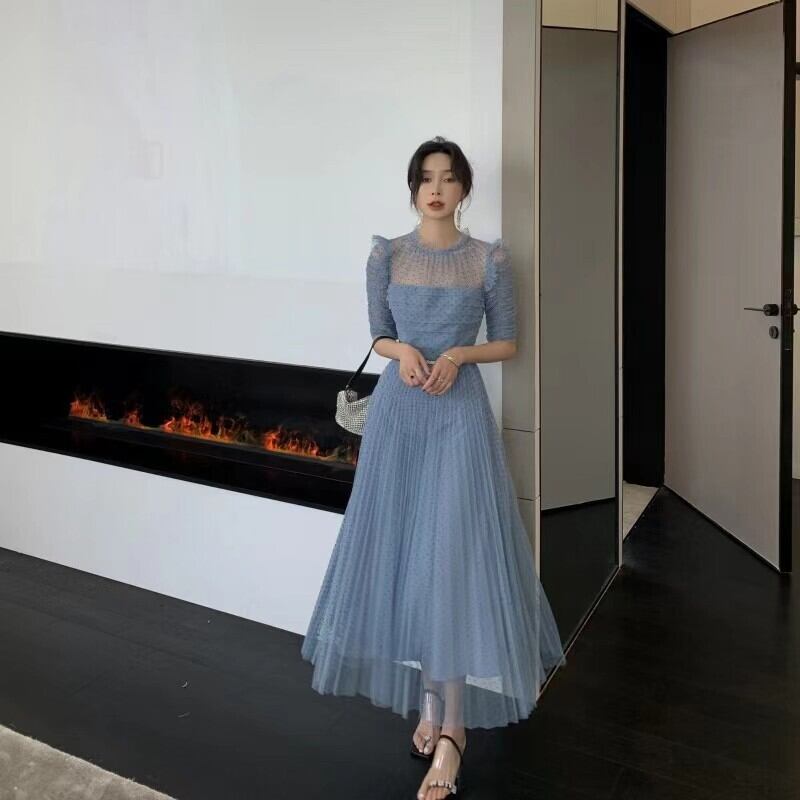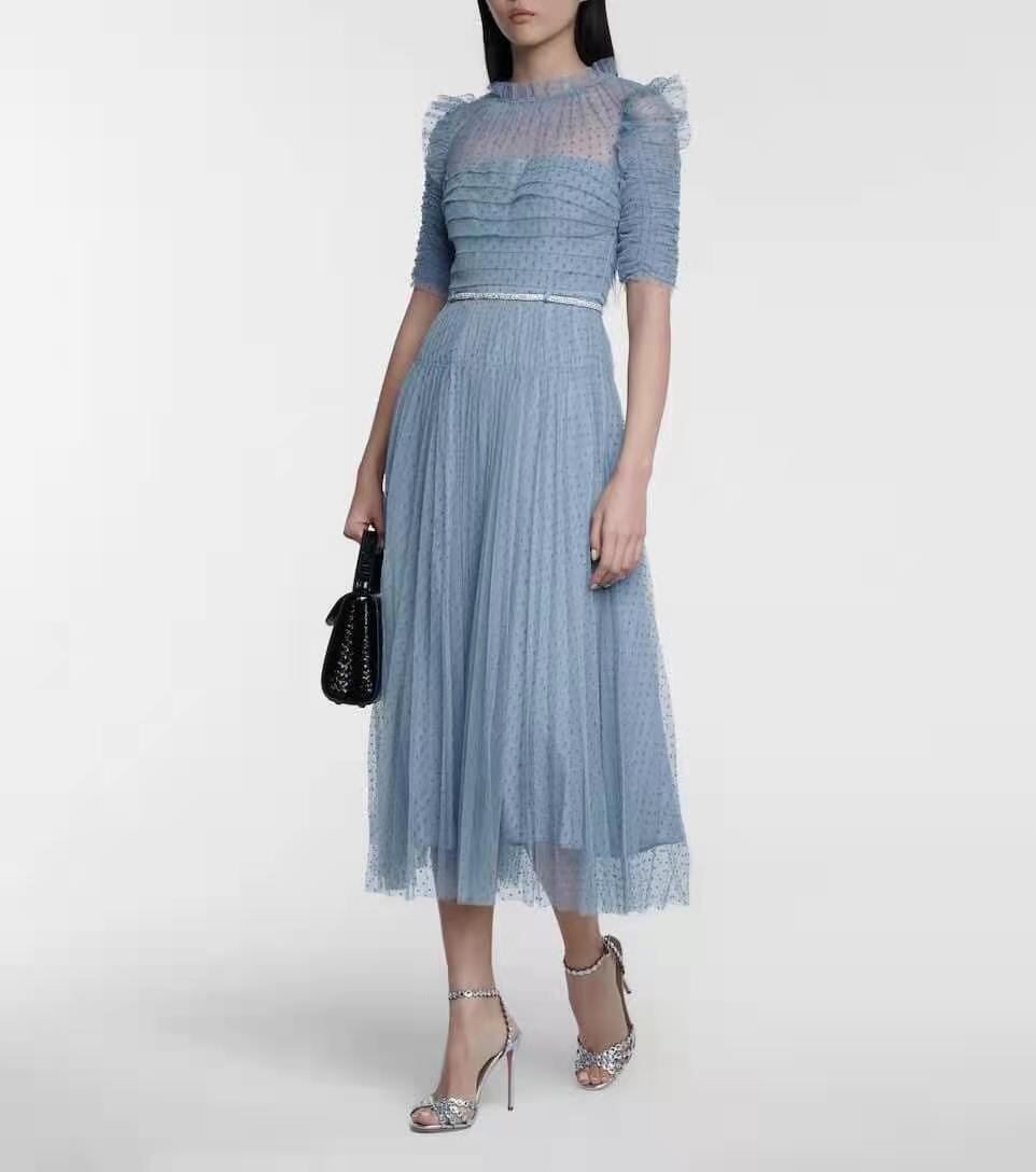 くすみブルーが可愛いシースルードットシフォンドレス。