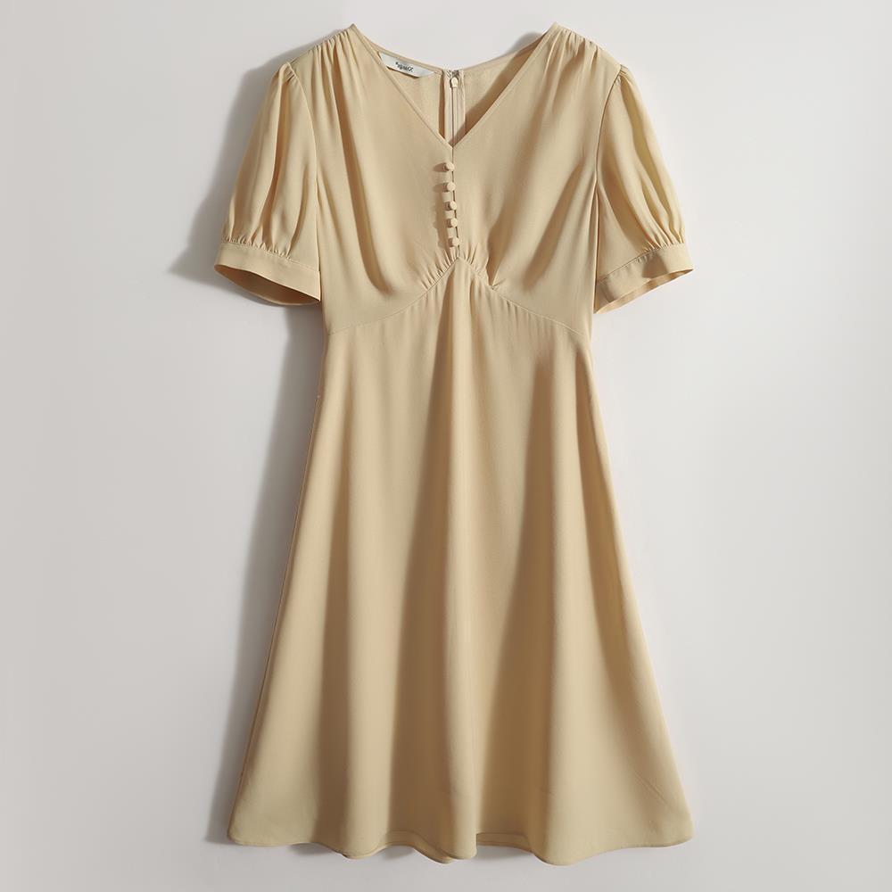 胸の切替やvネックなど女性らしいフェミニンさもプラス。