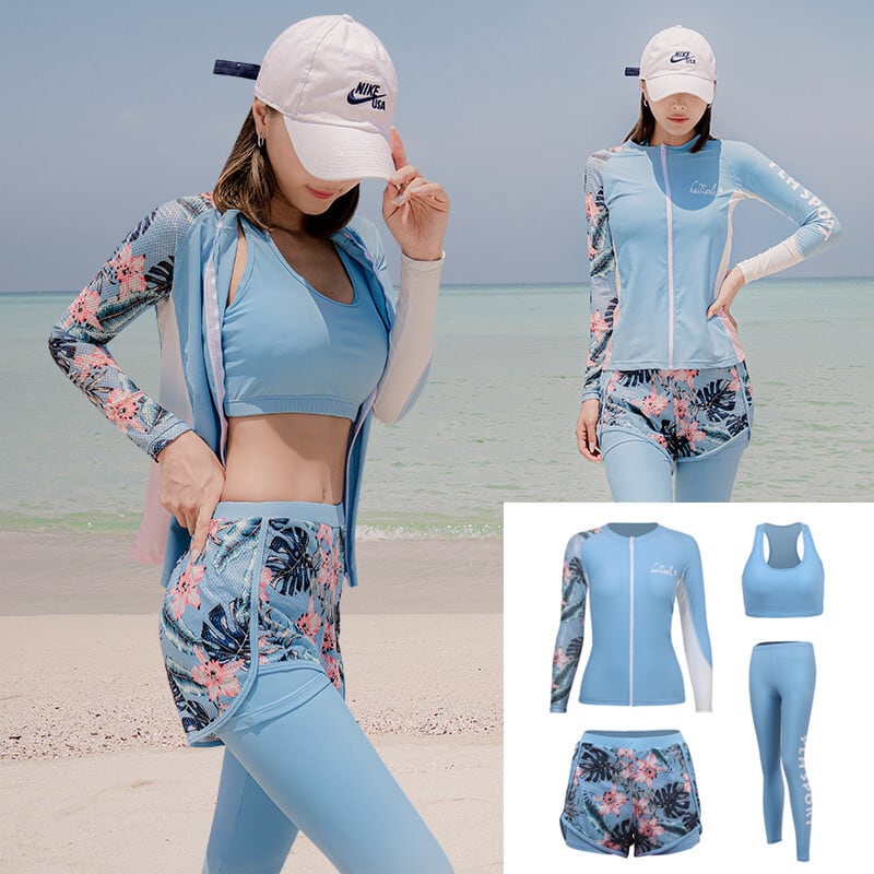 【水着】 大きいサイズ 水着 タンキニ レディース 体型カバー 4点セット 花柄 可愛い おしゃれ ラッシュガード 20代 30代 40代 ママ 水着 韓国 水着 パンツ 海 ビーチ プール リゾート スイムウェア ブルー 青 ライトブルー ブラック 黒 M L XL 2XL