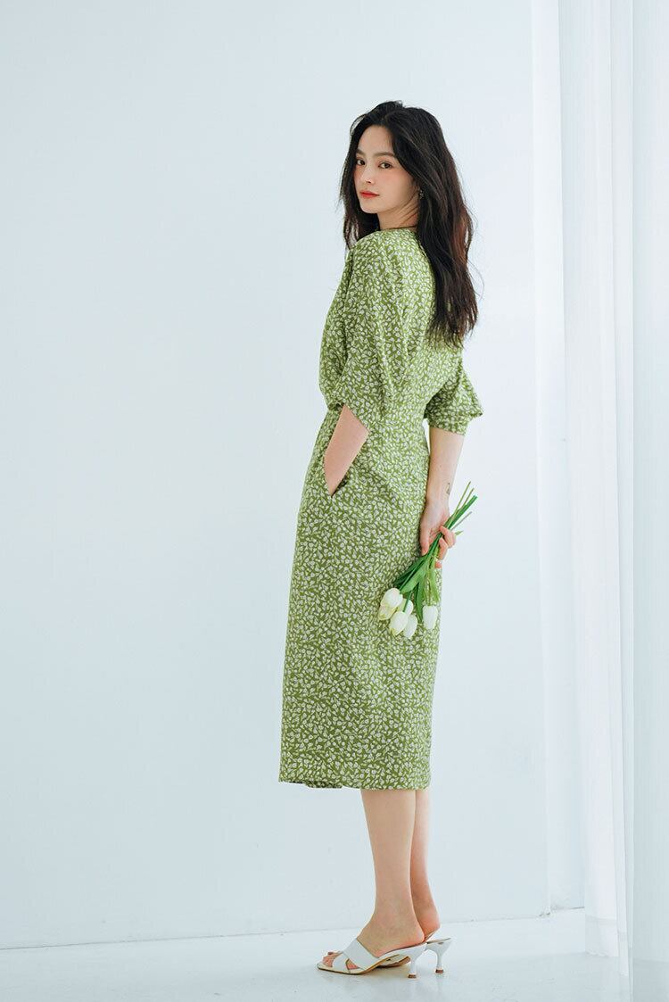ぱっと目を惹くグリーンカラーの小花柄ワンピース。