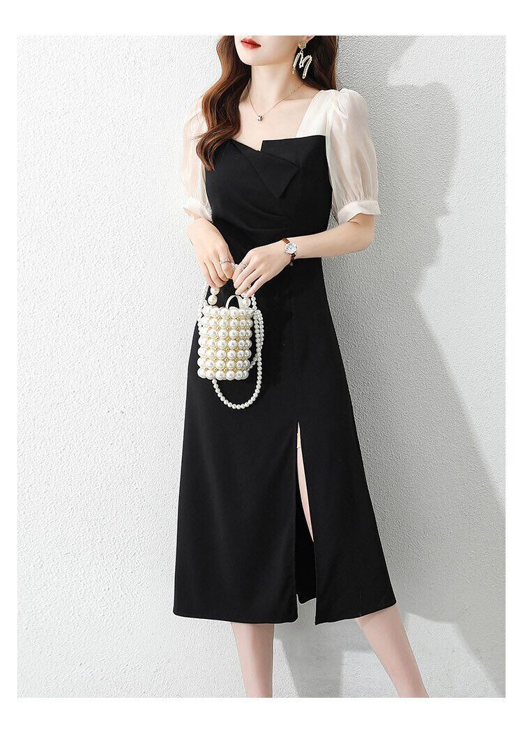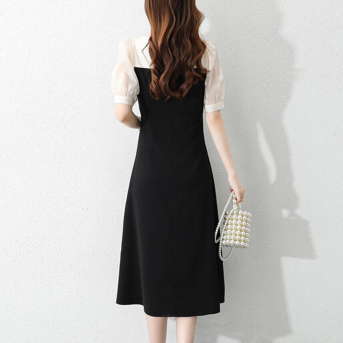 【ワンピース】ワンピース 春 夏 ワンピース ひざした ワンピース 膝下ワンピース きれいめ 膝丈 ワンピースドレス 韓国 ワンピース 半袖 ドレス ワンピース 春秋 ワンピース パフスリーブ バイカラー ワンサイズ
