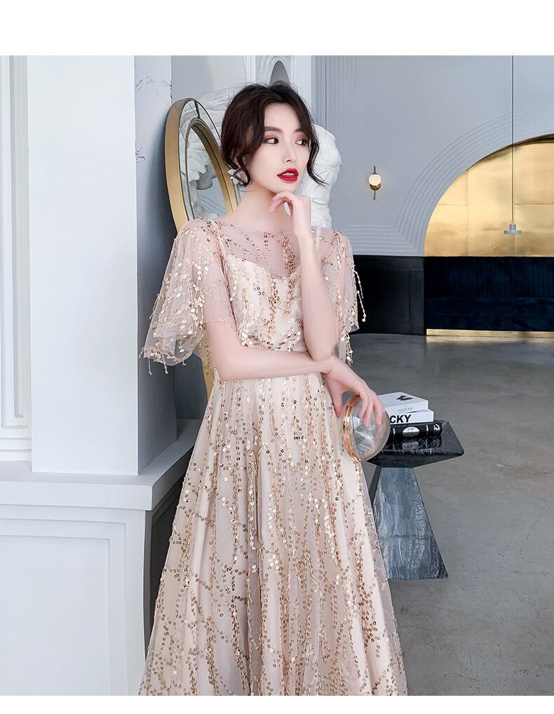 エレガントなシャンパンカラーのパーティードレス。