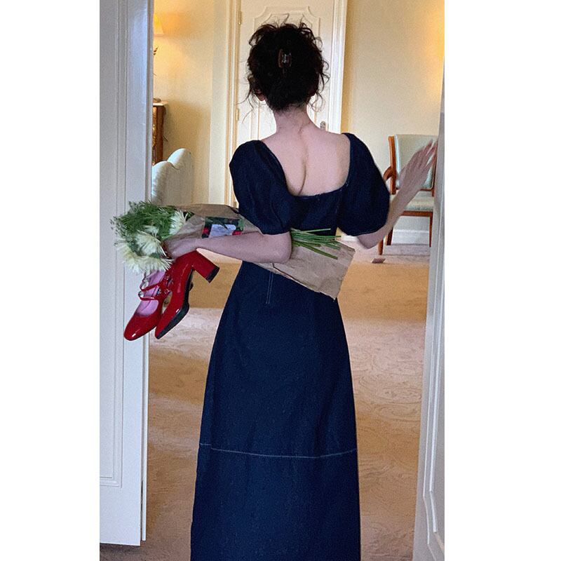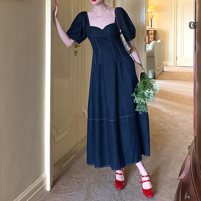 【ワンピース】ワンピース 春 夏 ワンピース 無地 ロングワンピース レトロ パフスリーブ マタニティ ワンピース レディース ロング丈 半袖 デニム ロングワンピース 韓国 ワンピース S-L
