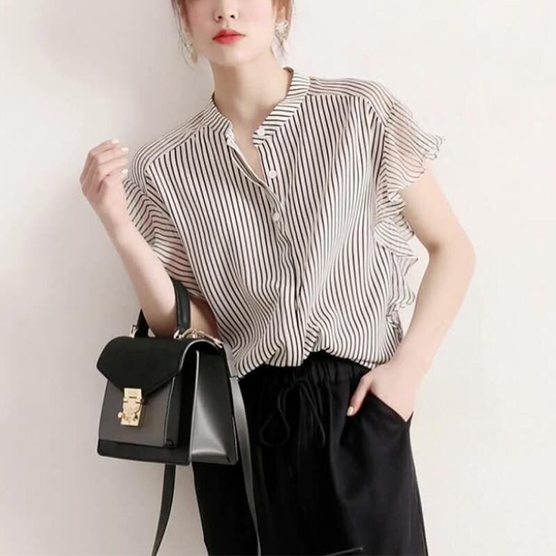 【ブラウス】大きいサイズ ブラウス ストライプ レディース シャツ ブラウス 韓国 ブラウス 春 夏 オフィス シフォン ブラウス フリル ブラウス 大人可愛い ブラウス オフィス レディース トップス