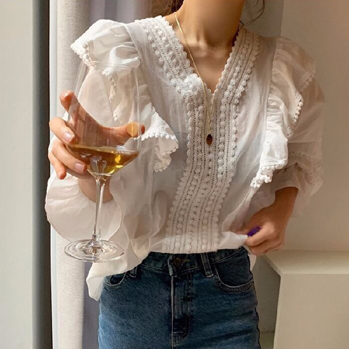 【ブラウス】 ブラウス 無地 レディース シャツ ブラウス 韓国 ブラウス 春 夏 秋 20代 30代 40代 シンプル フリル ブラウス きれいめ レトロ 可愛い レース ブラウス 白 オフィス レディース 七分袖 ブラウス 体型カバー 着痩せ トップス S-XL