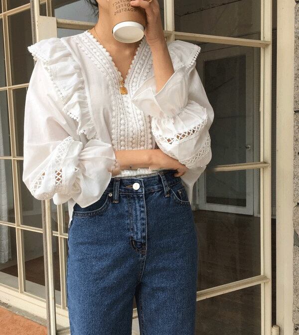 vネックで顔まわりがすっきり見え、繊細なフリルやレースが女性らしさをプラス。