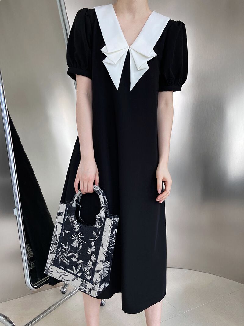 【ワンピース】ワンピース 春 夏 ワンピース 無地 バイカラー ロング ワンピース レトロ パフスリーブ 20代 30代 40代 マタニティ ワンピース レディース ロング丈 韓国 ワンピース 半袖 ドレス ロングワンピース 黒 M-L