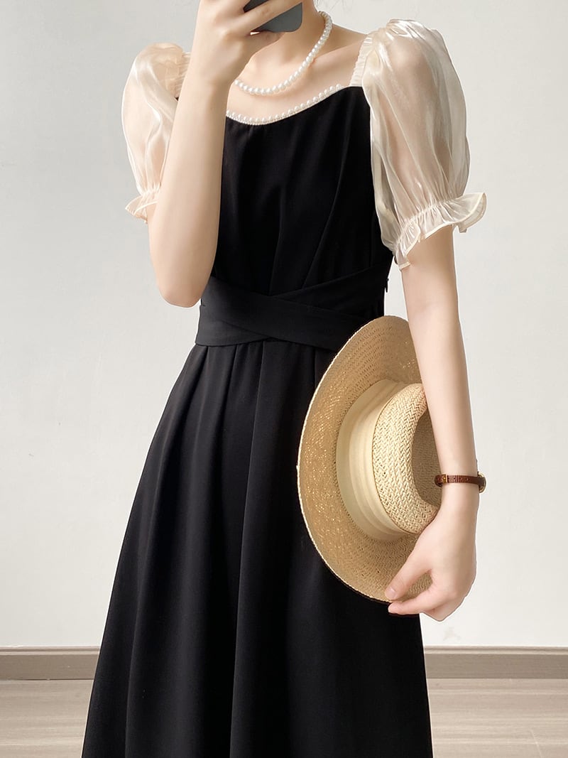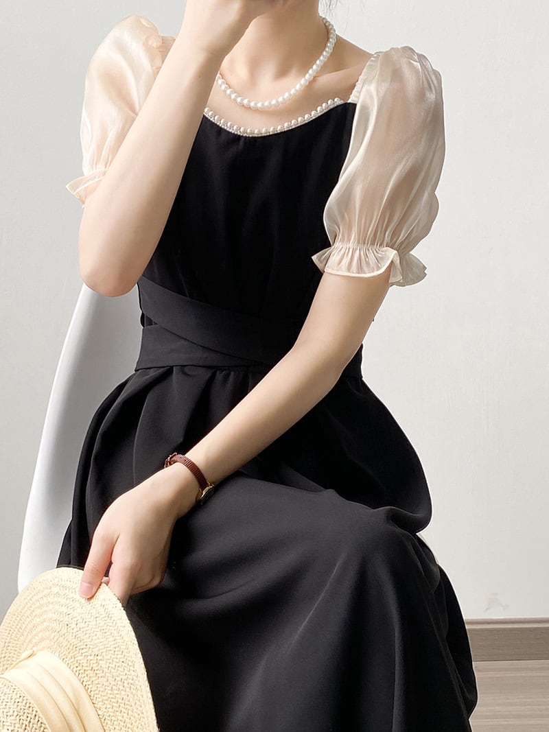 【ワンピース】 ワンピース 春 夏 無地 ワンピース パーティー 結婚式 バイカラー レトロ パフスリーブ 20代 30代 40代 ワンピース ひざした ワンピース 膝下ワンピース きれいめ 韓国 ワンピース 半袖 ドレス ワンピース M-XL