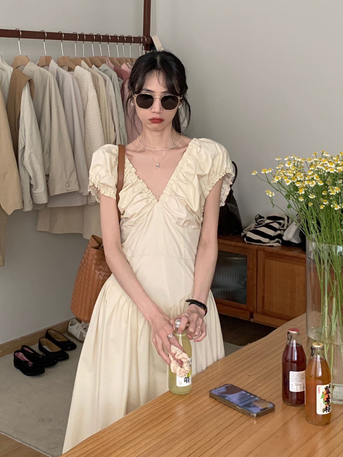 ギャザーたっぷりバックオープンワンピース。