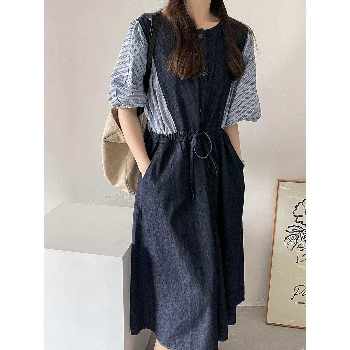 異素材mixデザインがカジュアルで可愛いデニムワンピース。