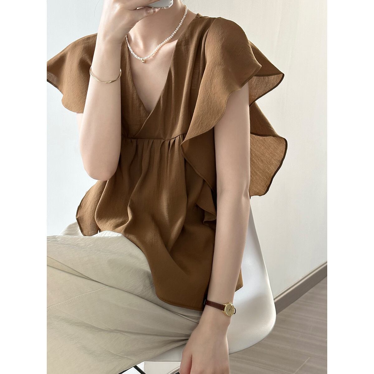 【ブラウス】ブラウス レディース 無地 レディース シャツ ブラウス 韓国 ブラウス 春 夏 秋 20代 30代 40代 シンプル フリル ブラウス レトロ 可愛い シフォン ブラウス オフィス レディース 半袖 ブラウス フォーマル トップス ブラウン M-L