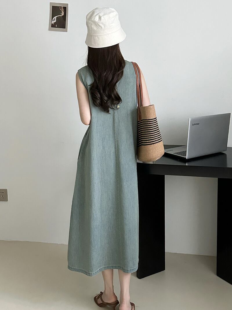 【ワンピース】ワンピース 春 夏 ワンピース 無地 デニム ワンピース ロングワンピース レトロ ノースリーブ 20代 30代 40代 マタニティ ワンピースロング丈 韓国 ワンピース 春秋 ワンピース シンプル S-M