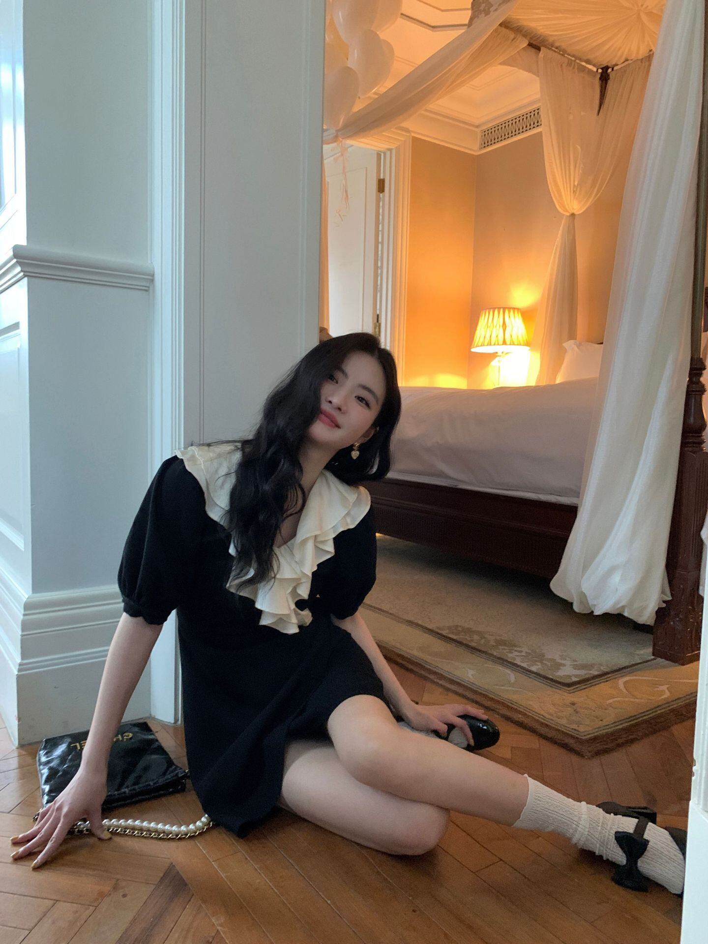 胸元のフリルが大人可愛いミニ丈ワンピース。