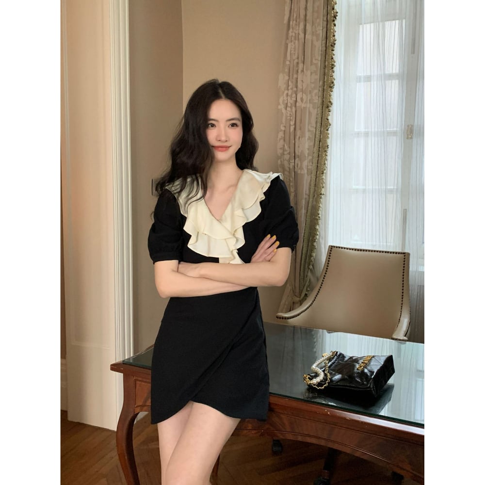 【ワンピース】 ワンピース レディース ミニワンピース 無地 ミニ丈 タイトミニワンピース レトロ パフスリーブ 半袖 五分袖 バイカラー 20代 30代 40代 秋 春 ワンピース ドレス 韓国 ワンピース 春夏 ワンピース 可愛い カジュアル S-M