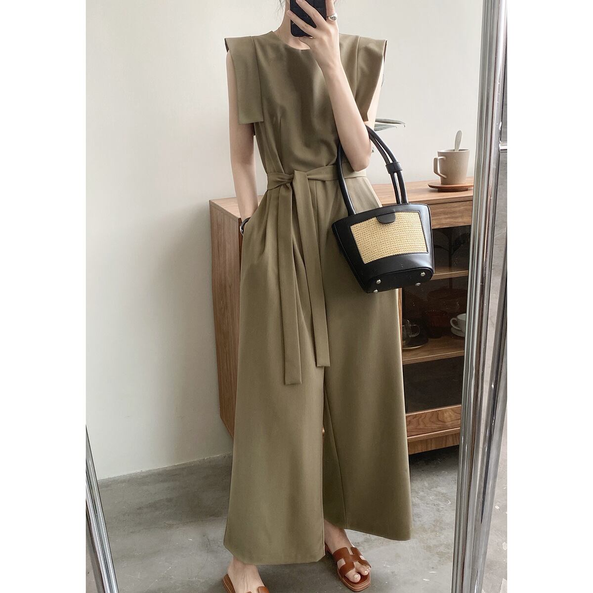 女性らしいシルエットのエレガントなパンツドレス。
