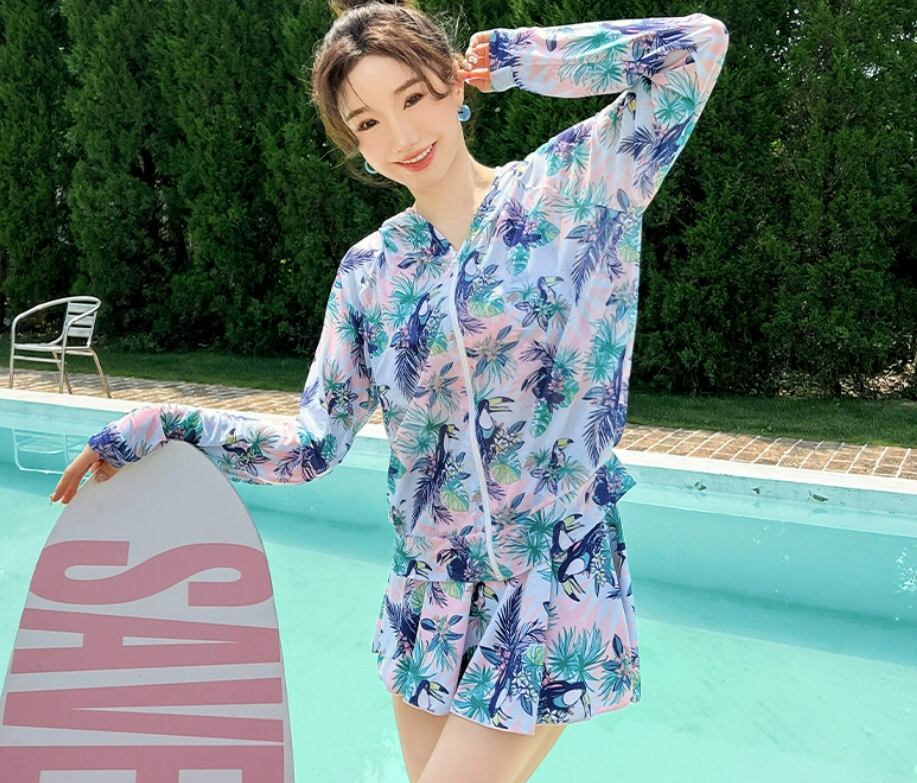 【水着】 タンキニ 体型カバー ラッシュガード 3点セット レディース 20代 30代 40代 ママ 水着 スカート付 カジュアル ボタニカル ネイビー 青 M-XL