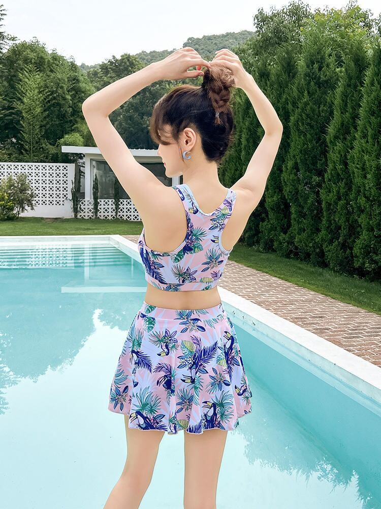 カジュアルなボタニカル柄のタンキニ水着。