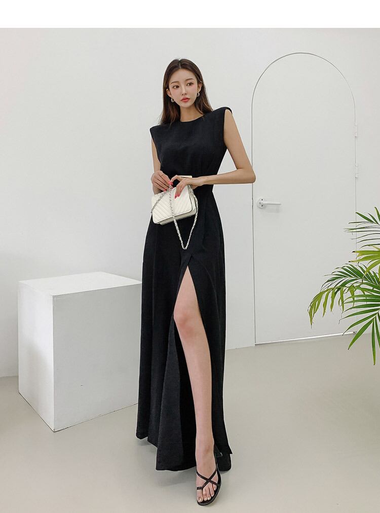 足元に大胆なスリットの入ったエレガントなパンツドレス。