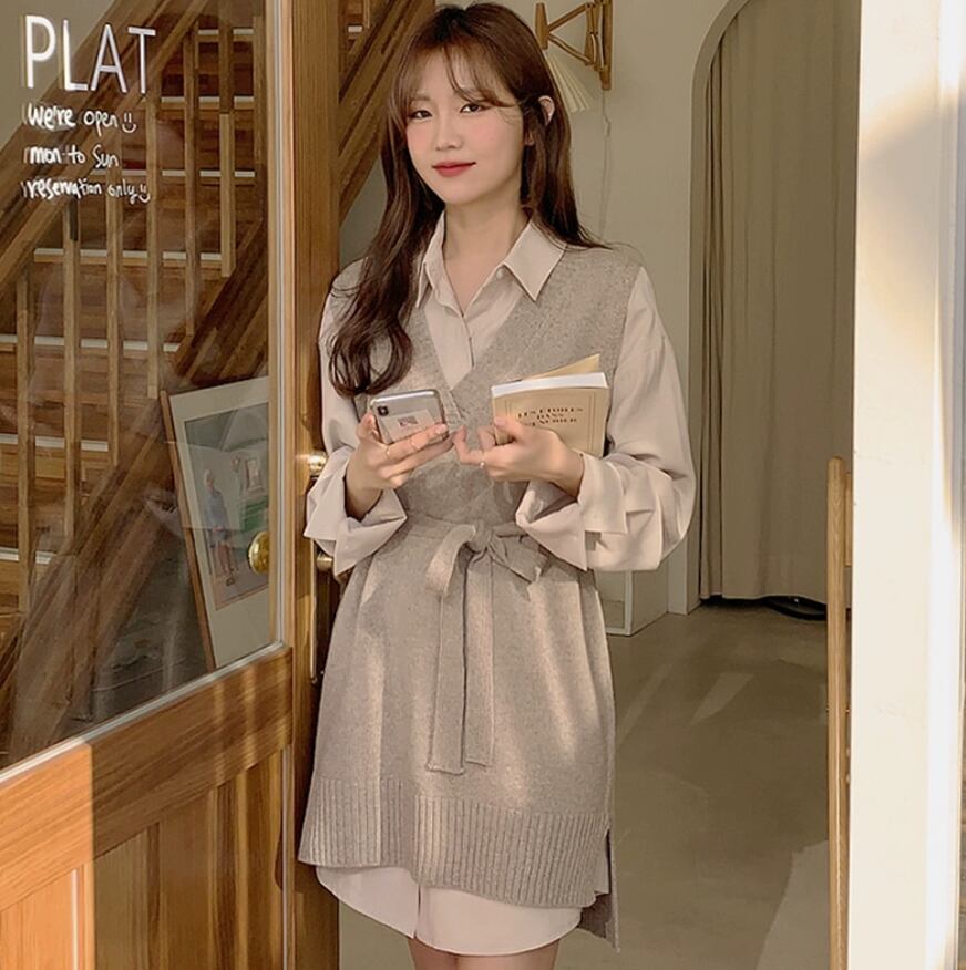 ヴィンテージライクなニットベスト+シャツワンピのセットアップ。
