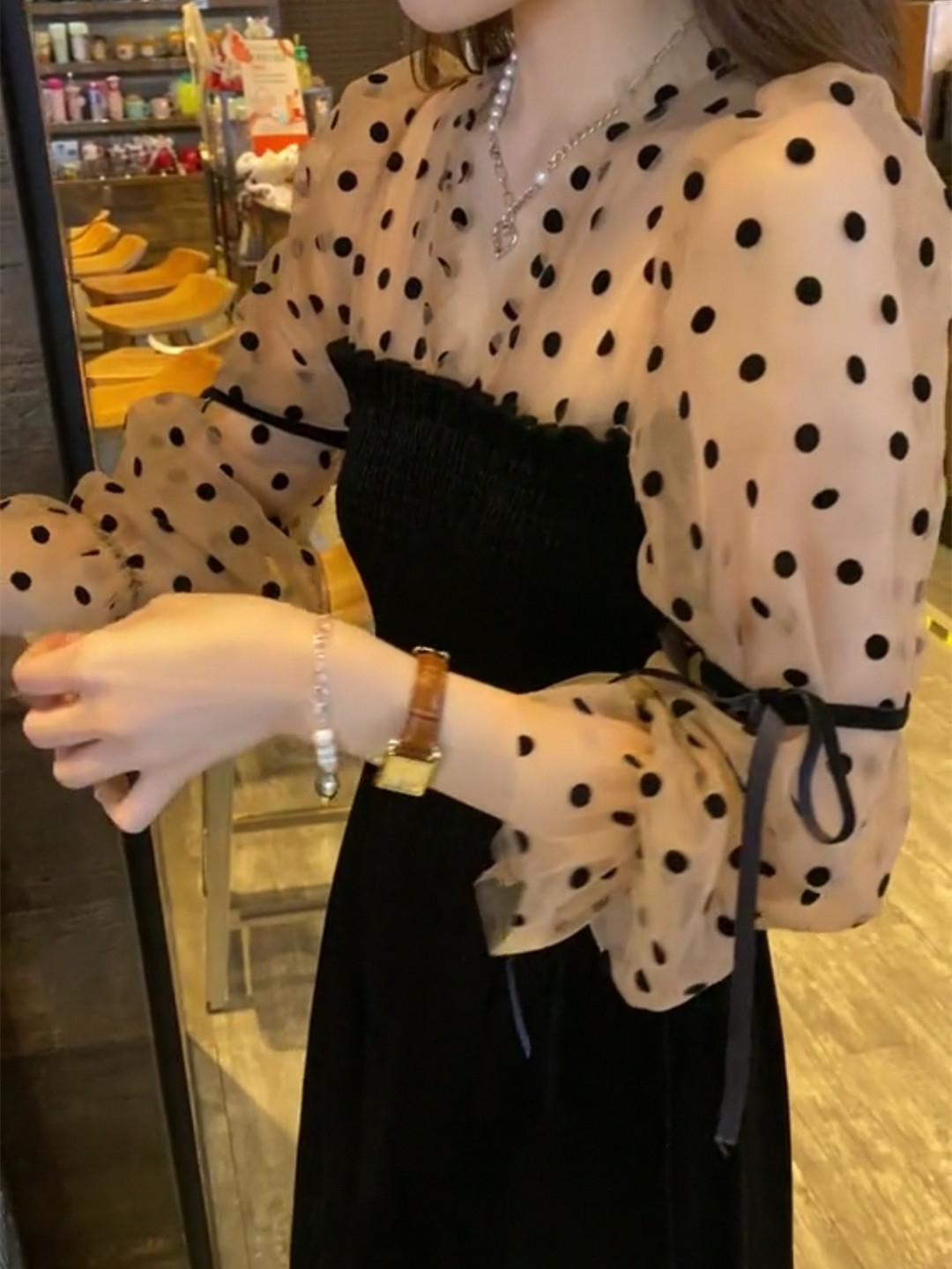 透け感あるドット&リボンのお袖が女性らしいフェミニンな一着。