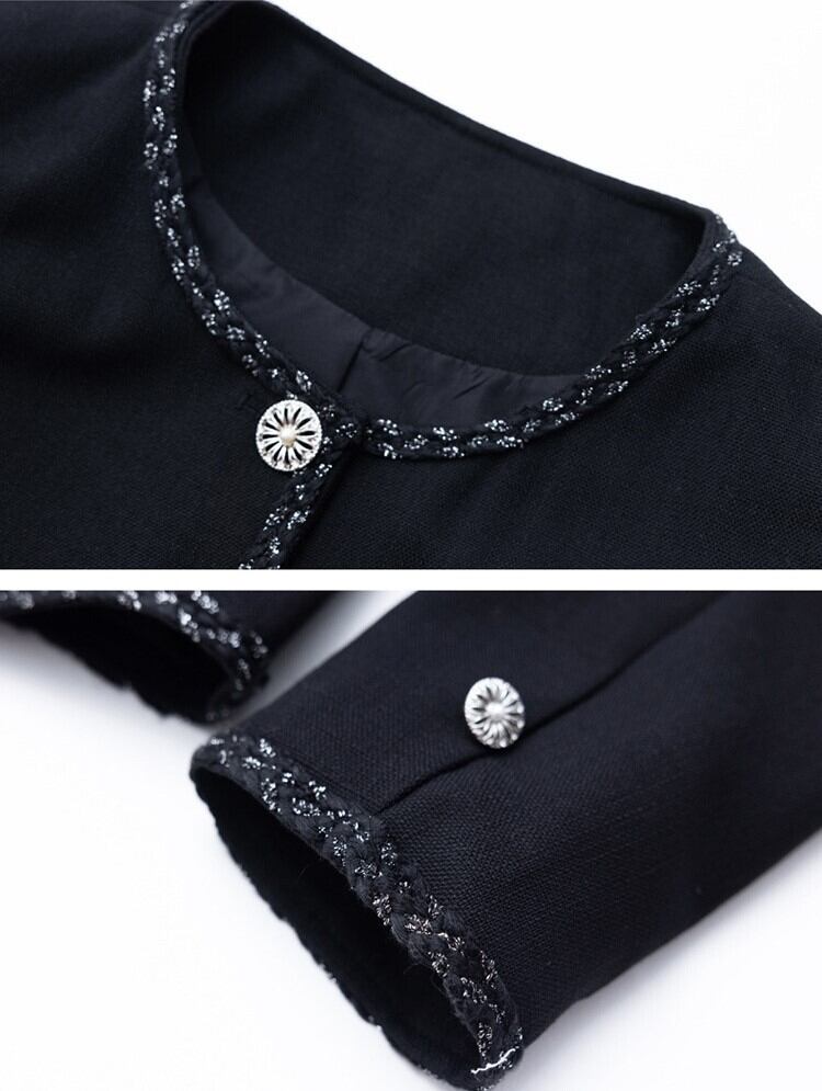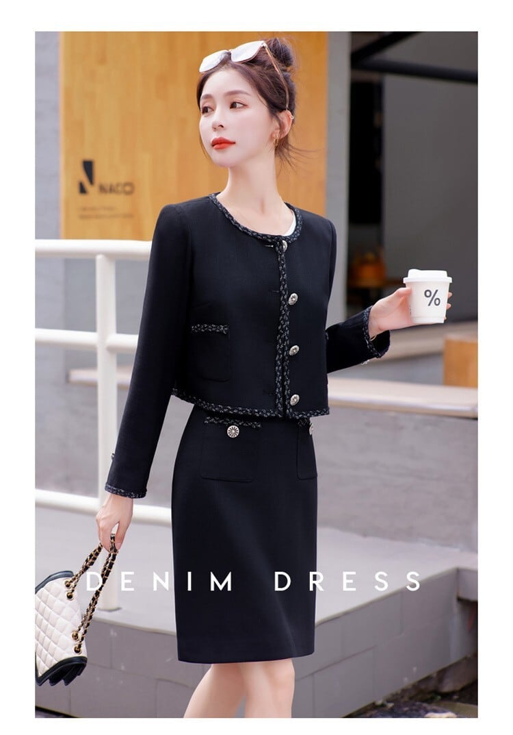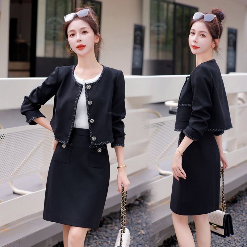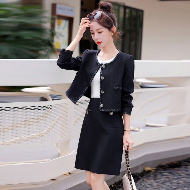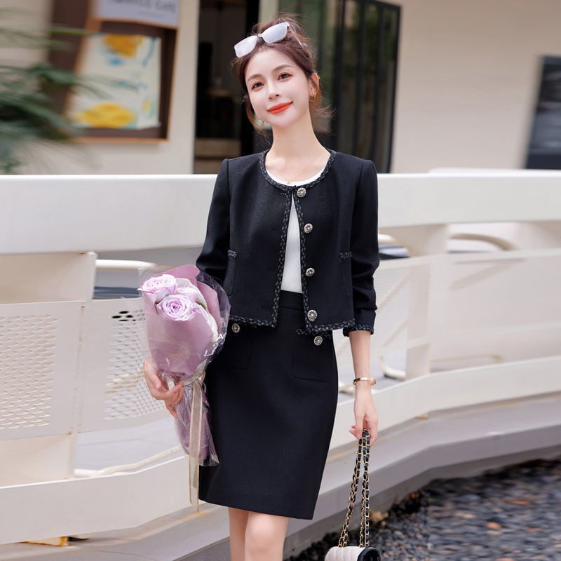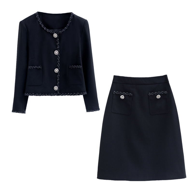 エレガントなショート丈ジャケット+スカートのセットアップ。
