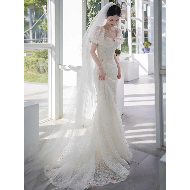 フラワーレースが繊細で可愛らしいウェディングドレス。