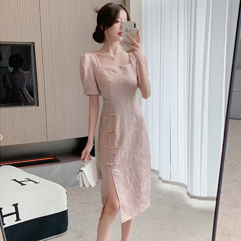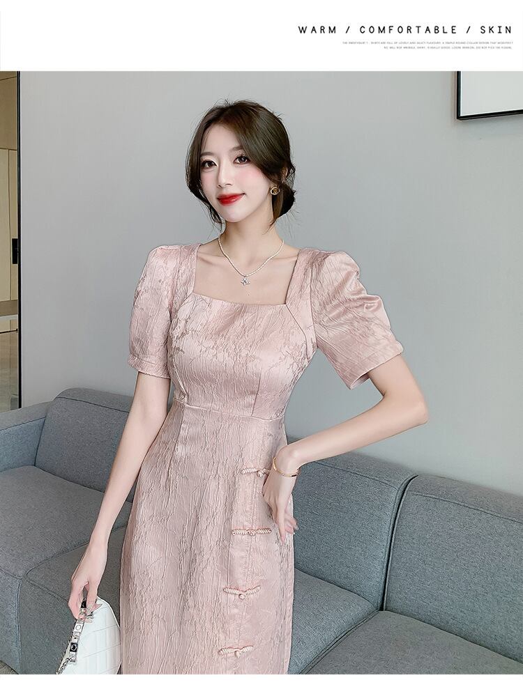 スクエアネックでデコルテをすっきりきれい見せしてくれるパーティードレス。