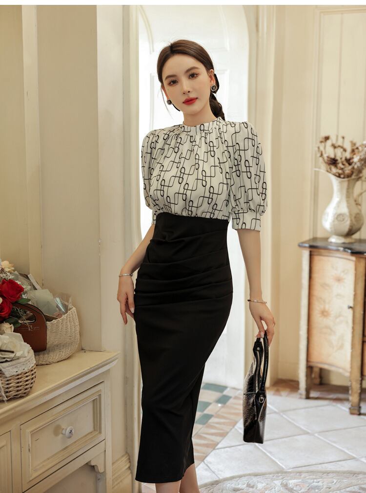 エレガントなフェイクツーピースのパーティードレス。