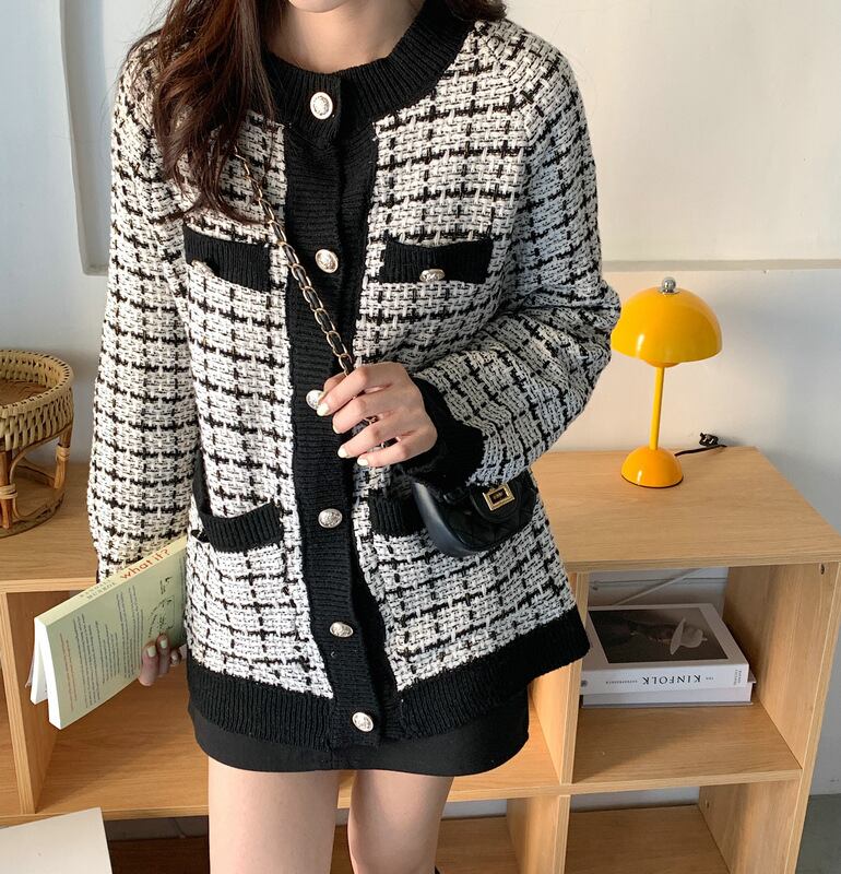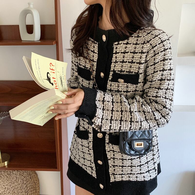 ジャケットが苦手な方にもおすすめの千鳥格子のカーディガン。