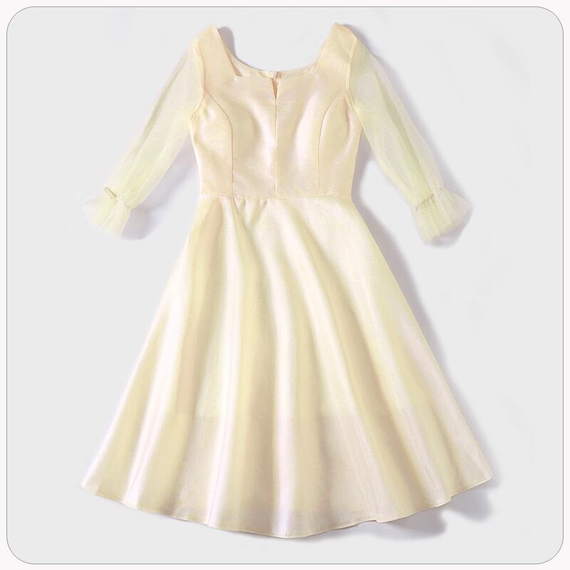 サテン生地の上品でエレガントなパーティードレス。