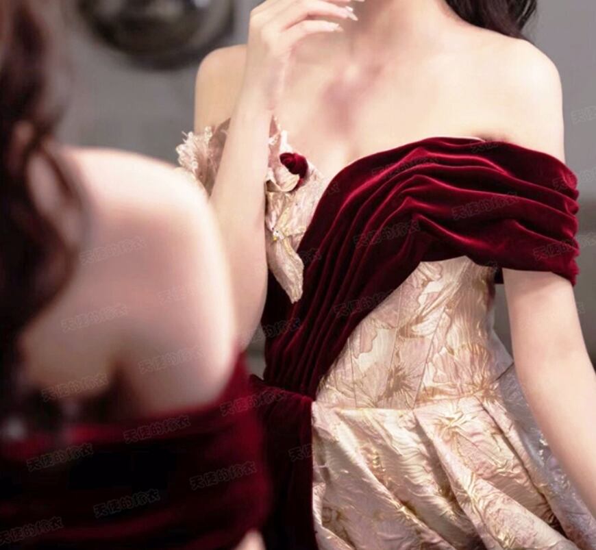 ショルダーのベルベットとフラワーモチーフがエレガントなカラードレス。