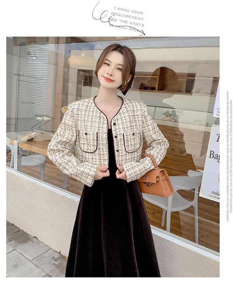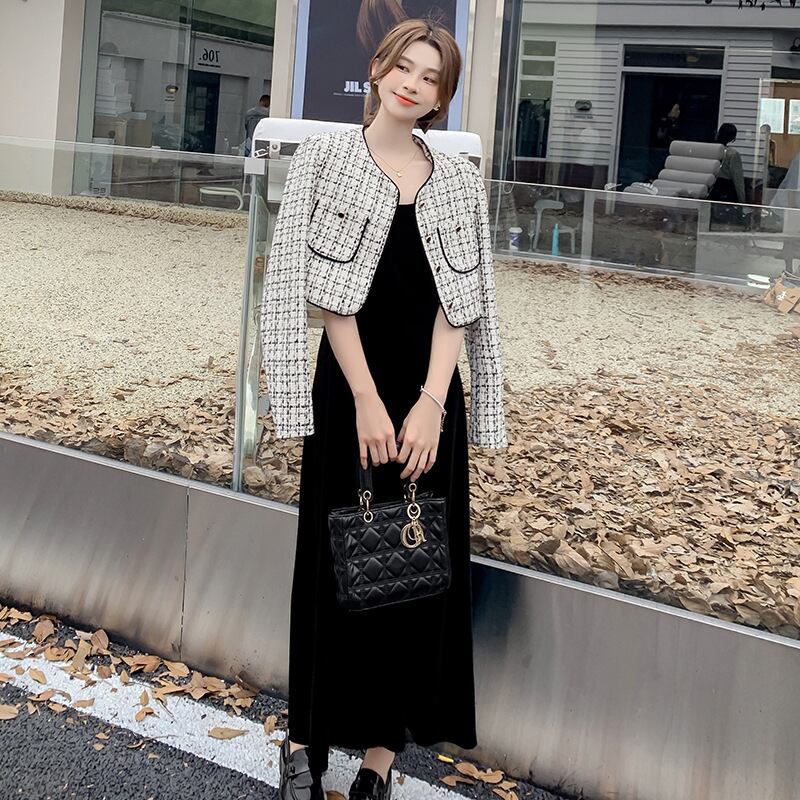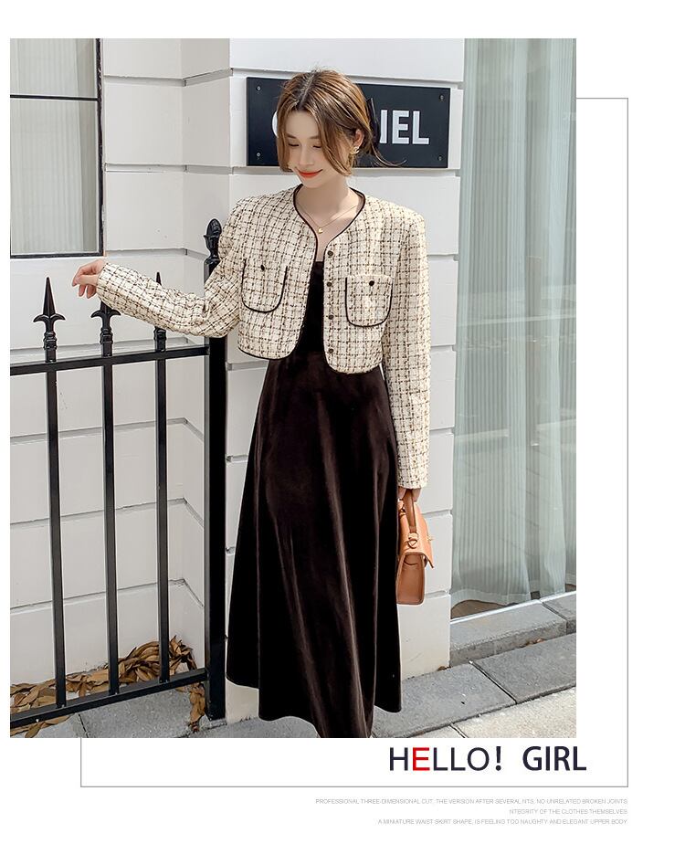 ツイードジャケット+ベルベットワンピースのセットアップ。