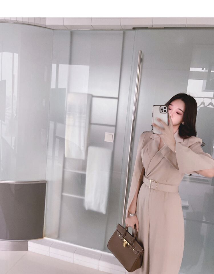 エレガントなスリットスリーブのパンツドレス。