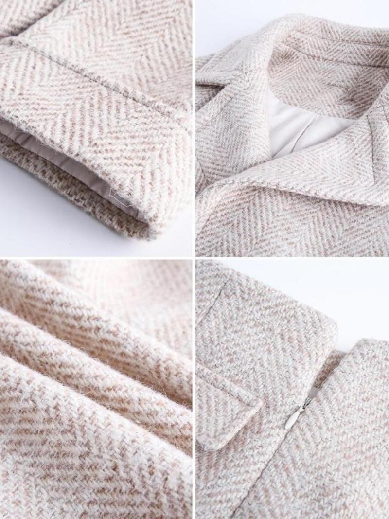 ヘリンボーン素材のミルキーカラーで顔映りも華やかに。