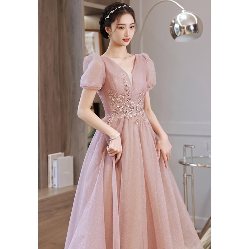 パフスリーブやきらびやかなスパンコールなど上品な雰囲気のドレス。