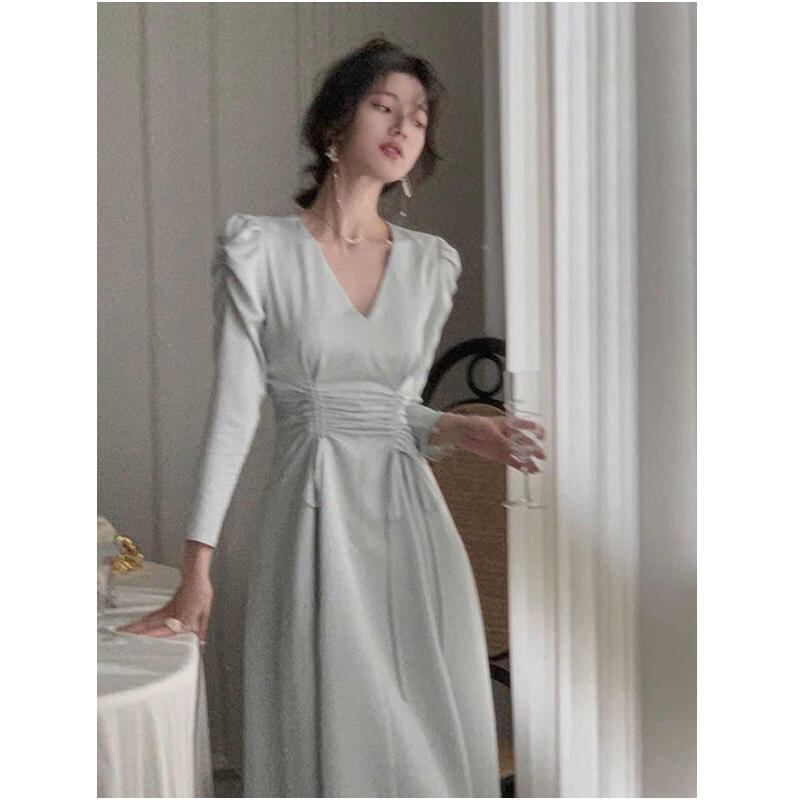 ウエストのギャザーが印象的な大人エレガントなパーティードレス。