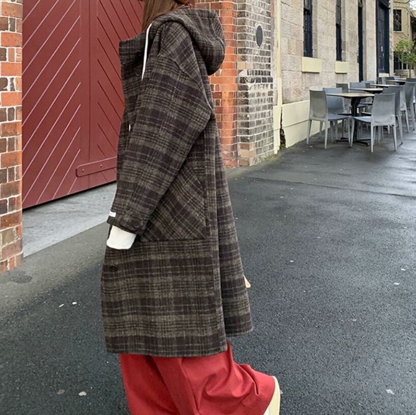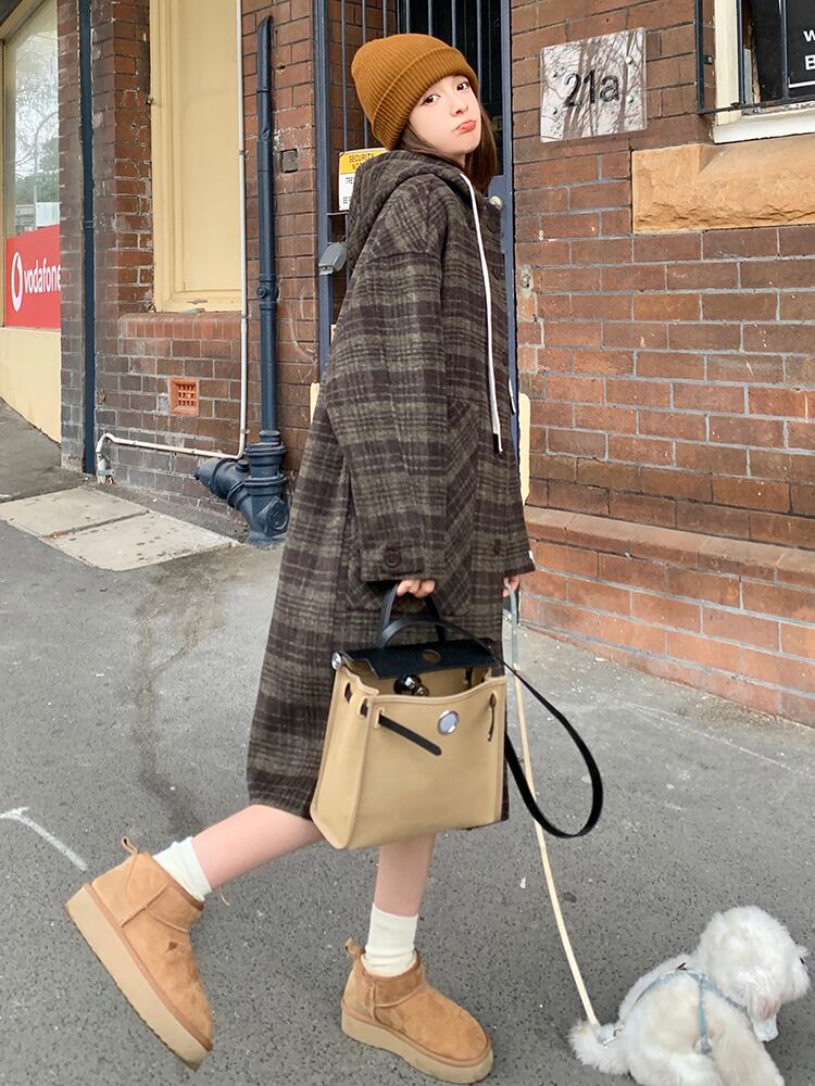 ヴィンテージライクなフード付きのチェックコート。