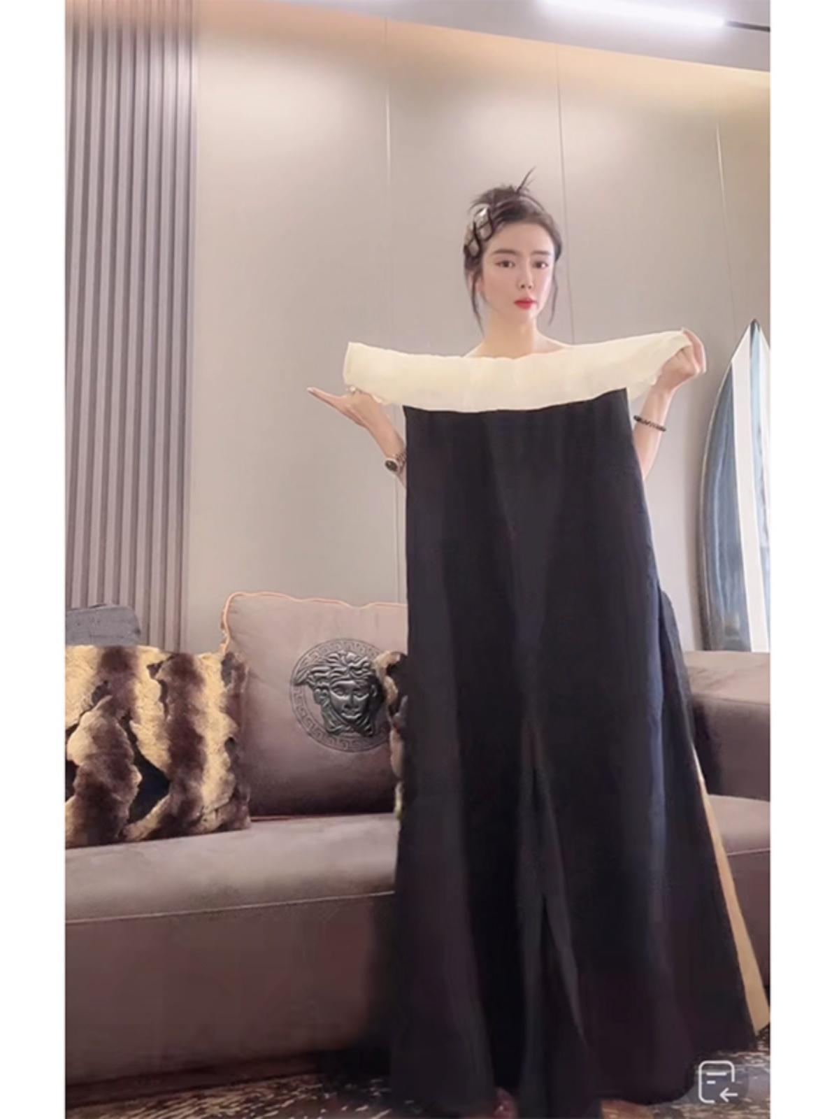胸のフリルが女性らしくエレガントなパンツドレス。