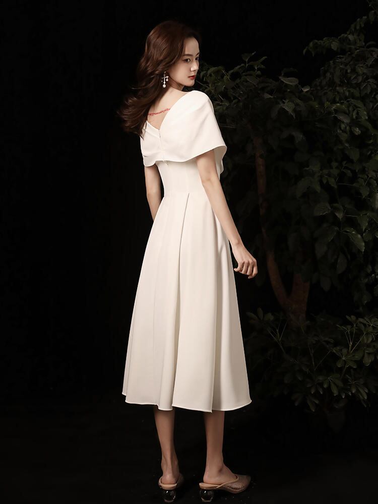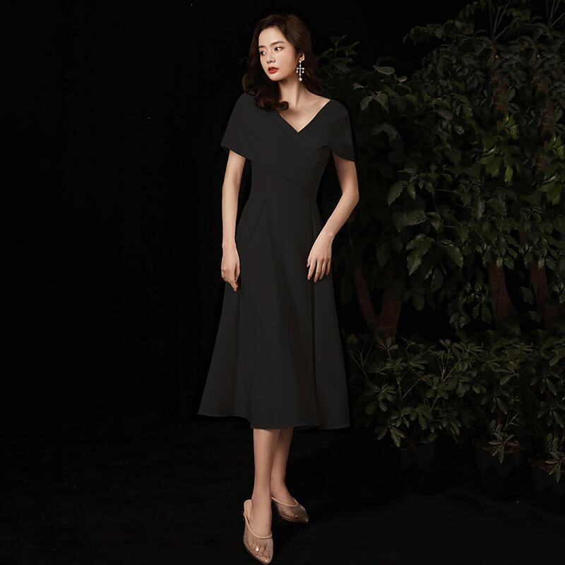 大人エレガントなミモレ丈のアシンメトリーパーティードレス。